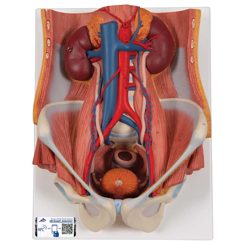 La mitad frontal del riñón derecho es desmontable. Con un inserto masculino fácil de desmontar (vejiga y próstata, mitad frontal y posterior) e inserto femenino (vejiga, útero y ovarios, 2 mitades laterales). Las piezas están numeradas. Sobre un base.