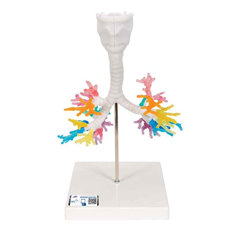 La laringe con el hueso hioides y la epiglotis, así como las vías aéreas con los bronquios principales y lobares, se representan en colores. A la altura del segundo cartílago traqueal se puede quitar la laringe que es divisible en su parte medial. La epiglotis tiene un montaje móvil.