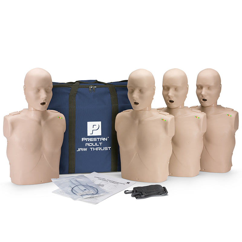 Maniquí de entrenamiento profesional de CPR / AED / empuje de la mandíbula mediana para adultos (paquete de 4) de Prestan Products. Disponible con o sin monitor de RCP. Incluye 50 bolsas de pulmón con protector facial y estuche de nylon.
